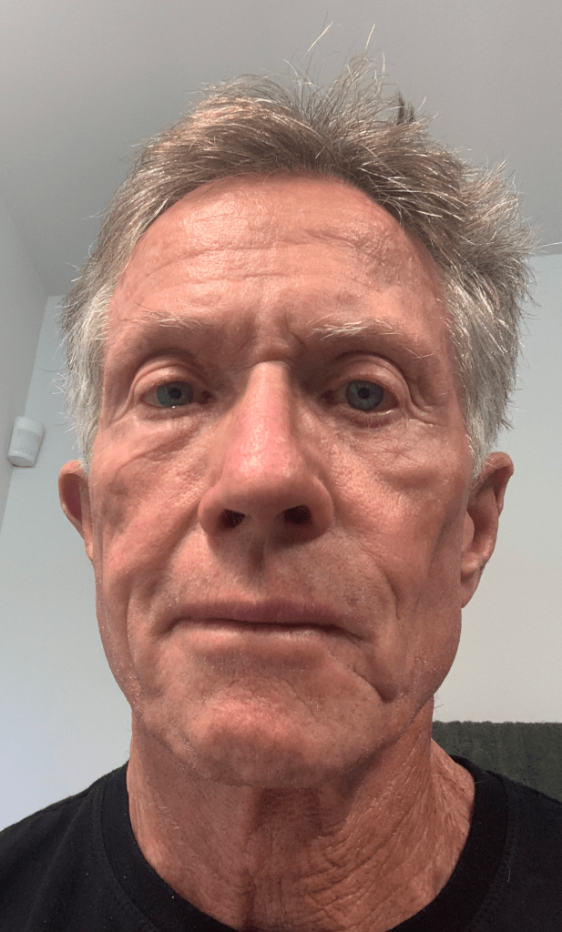 This photo taken recently, you can see the scar on the left side of my chin. Also, under my left eye is a bump from the titanium facial reconstruction.